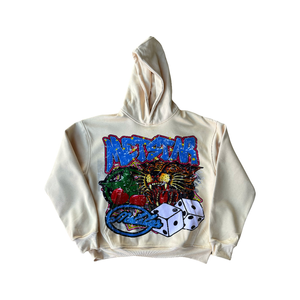 Displayed on a heavyweight quality cream hoodie, the “MS Chest piece” design is printed in black, blue, hot pink, yellow, red, and green. The design is curated to exaggerate a chest tattoo with a tiger, dice, cherries and a neon Metstar sign