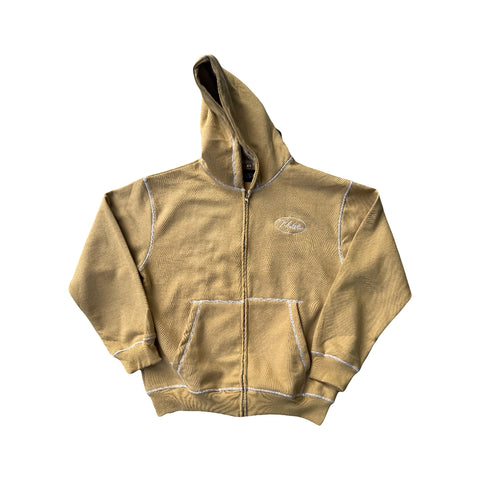 Displayed on a quality contrast stitch heavyweight khaki zip up hoodie and loose fit sweatpants the “MS Cursive logo" is embroidered on the left side in white