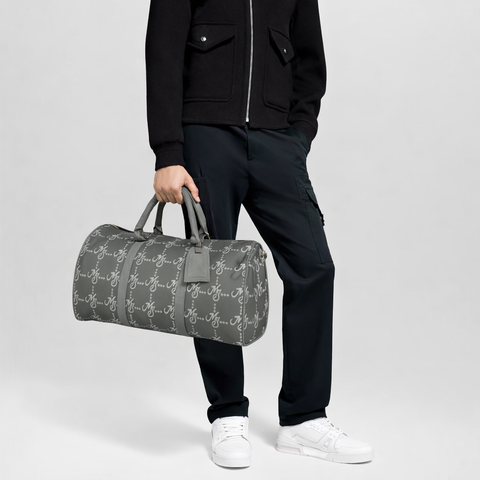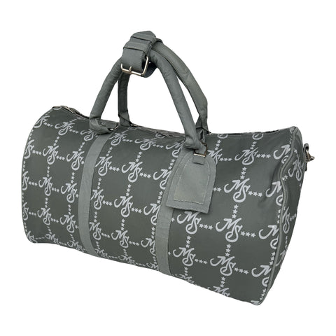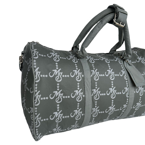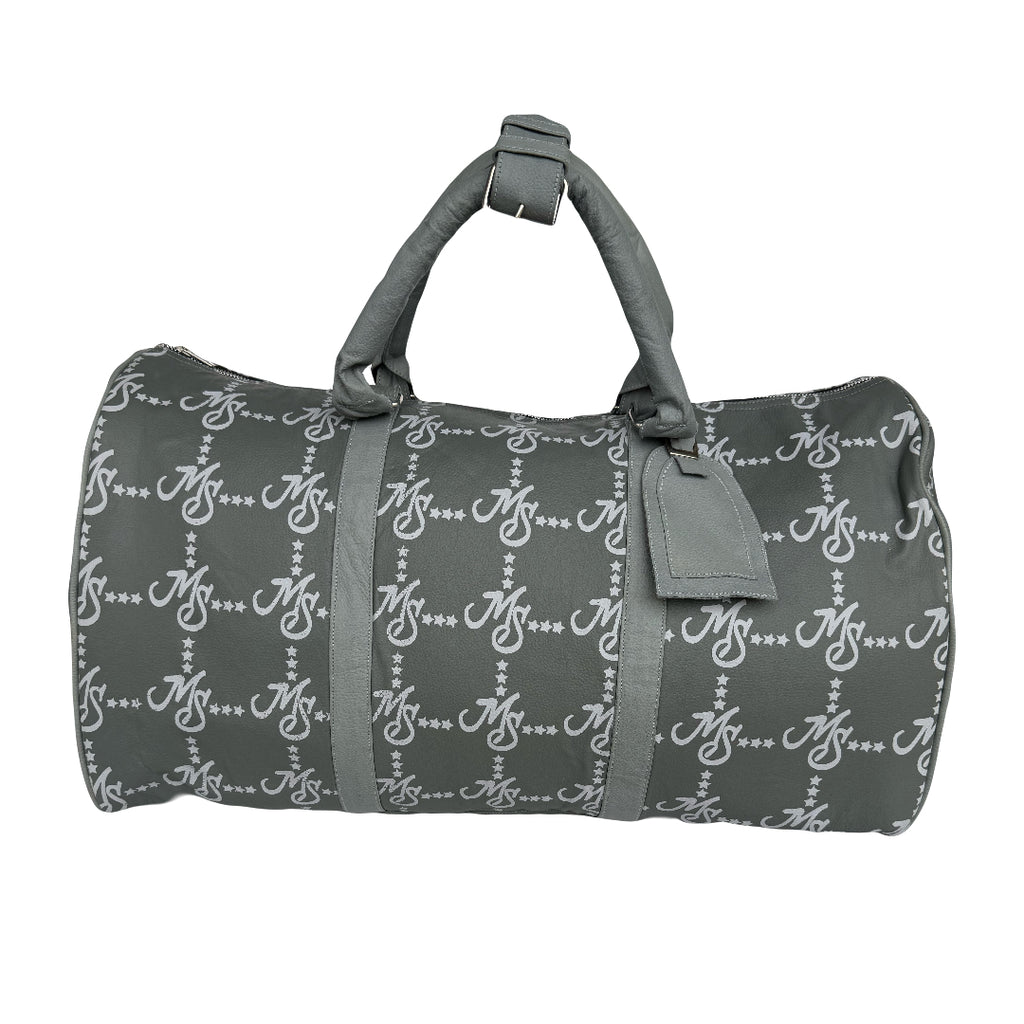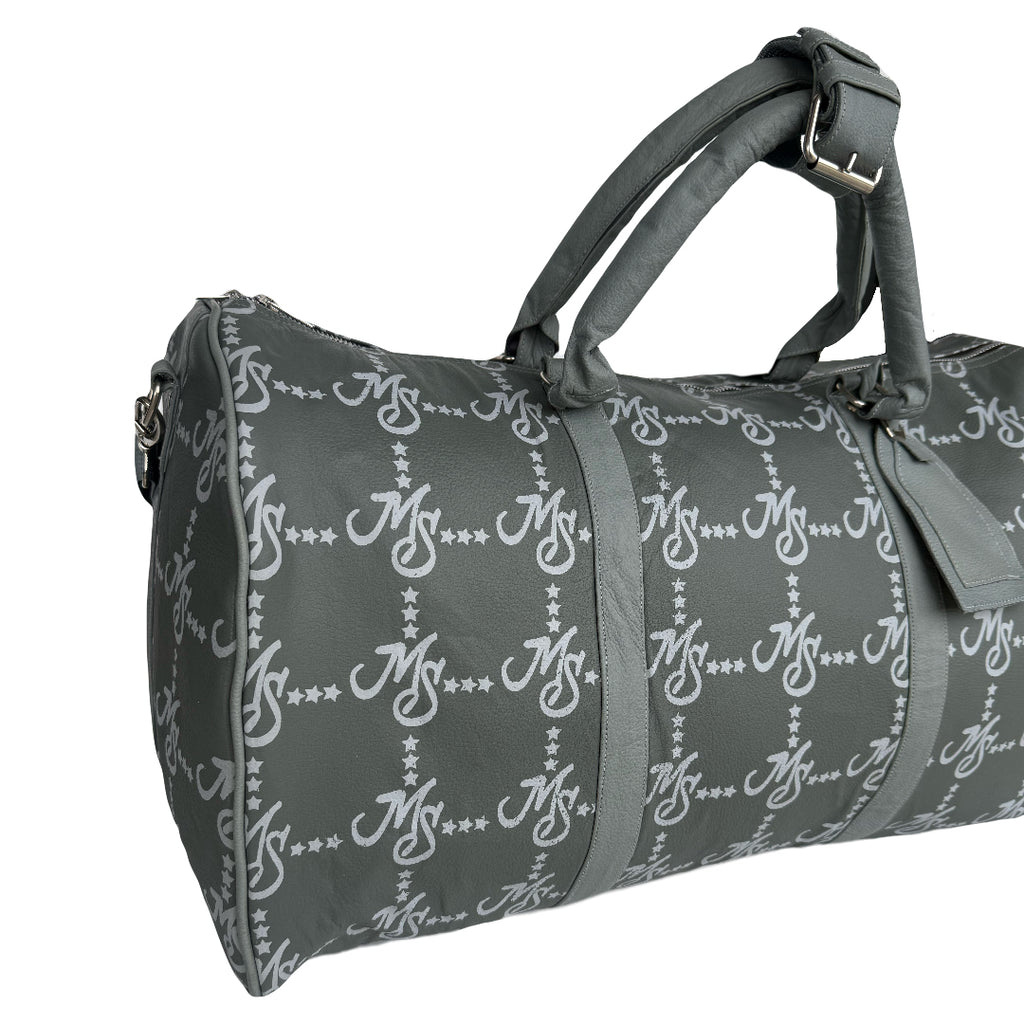 Displayed on a quality heavyweight gray leather duffle bag the "MS Monogram" design is printed in light gray. The bag has two leather handles and a large shoulder strap for easy transportation