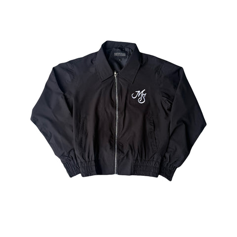 Displayed on a quality nylon black jacket and black pants, the “MS Monogram" logo is embroidery on the left side in white