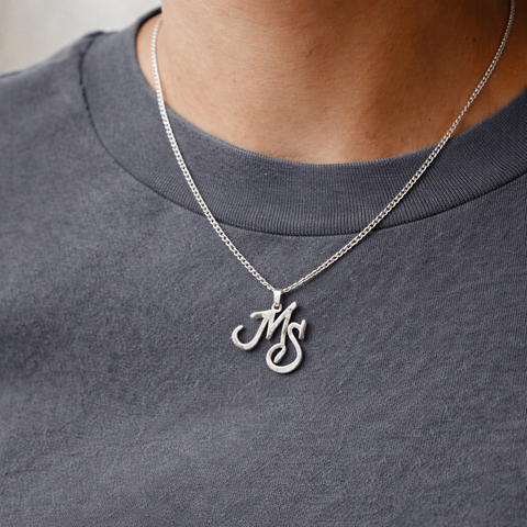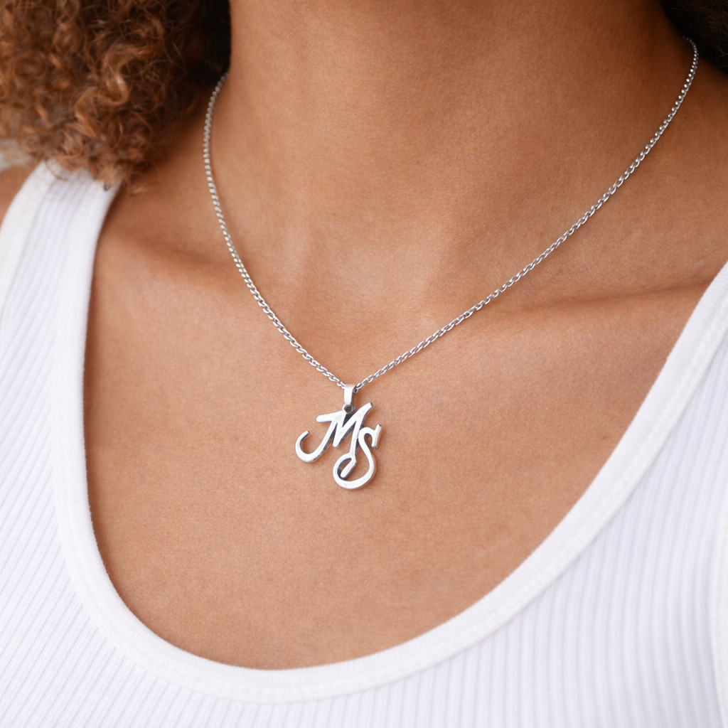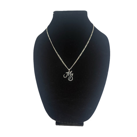 Displayed on a quality 20 inch stainless steel necklace the "MS Monogram" logo is made into a 1 inch 3D pendant. There are two clasp connections that allows easy attachment and removal