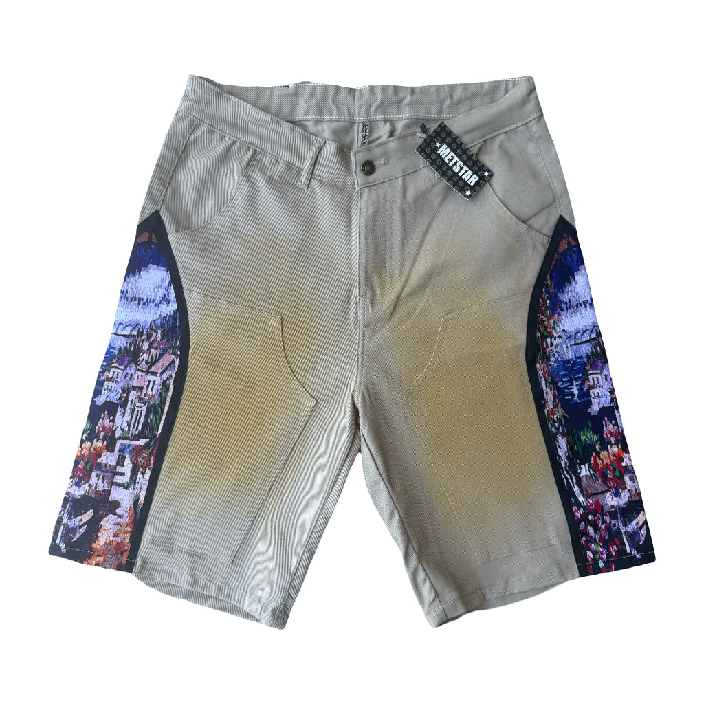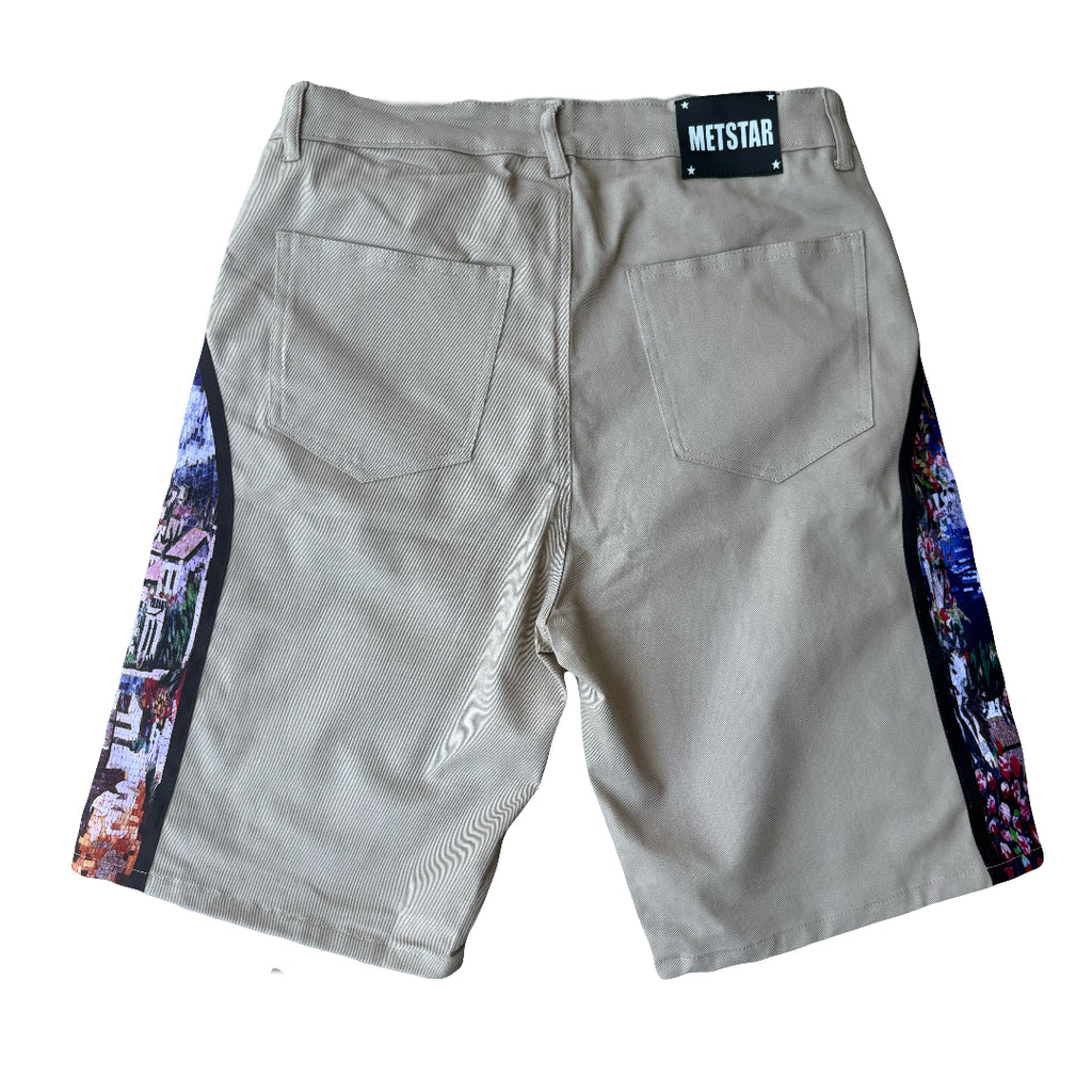 Displayed on a pair of quality heavyweight khaki yellow faded wash shorts the “MS Mosaic” design is printed going down the leg in a pyramidal shape