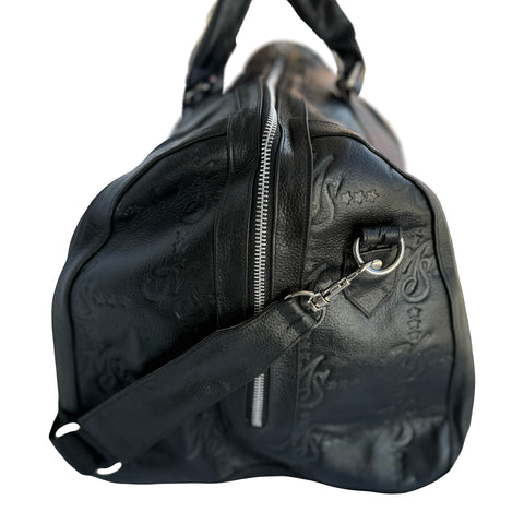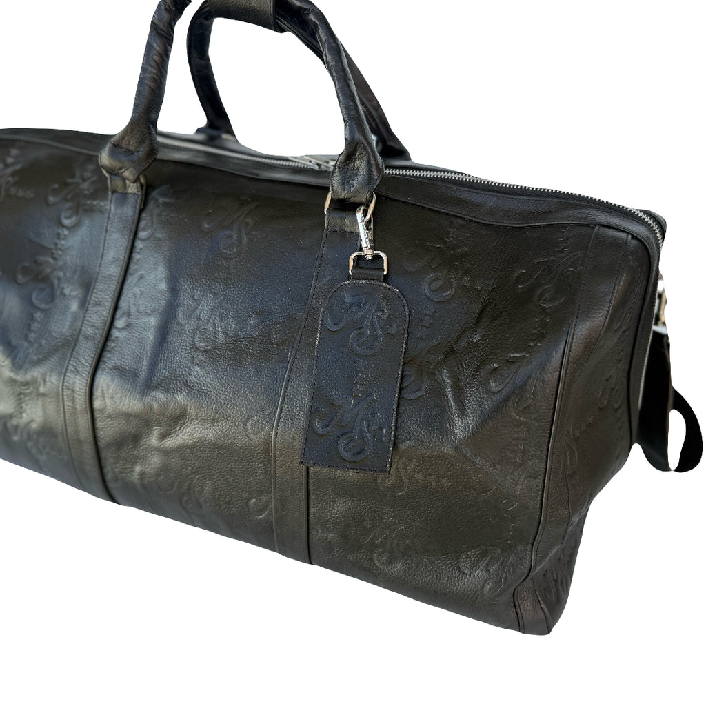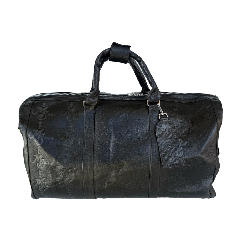 Displayed on a quality heavyweight black leather duffle bag the "MS Monogram" design is embossed all over. The bag has two leather handles and a large shoulder strap for easy transportation
